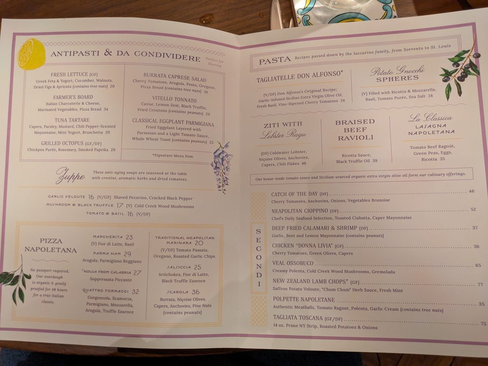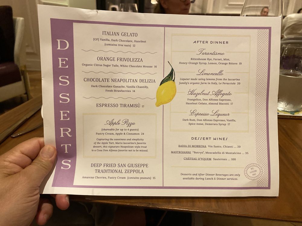 Located in St. Louis, Casa Don Alfonso is a high-end pizza and seafood restaurant offering a variety of amenities. The classy establishment boasts a full bar, valet parking, and options for outdoor seating. With a focus on sustainability, Casa Don Alfonso provides compostable containers and plastic-free packaging. The menu features Italian-inspired dishes like Burrata Caprese Salad, Quattro Formaggi Pizza, and Potato Gnocchi Spheres. The ambiance is described as pampering, with copper accents and a captivating open kitchen. While some dishes like the Calzone and Burrata Caprese Salad receive high praise for their flavors and textures, other items like the Dark Chocolate Gelato may fall short. Overall, Casa Don Alfonso is recommended for special occasions, offering a relaxed atmosphere and attentive service.