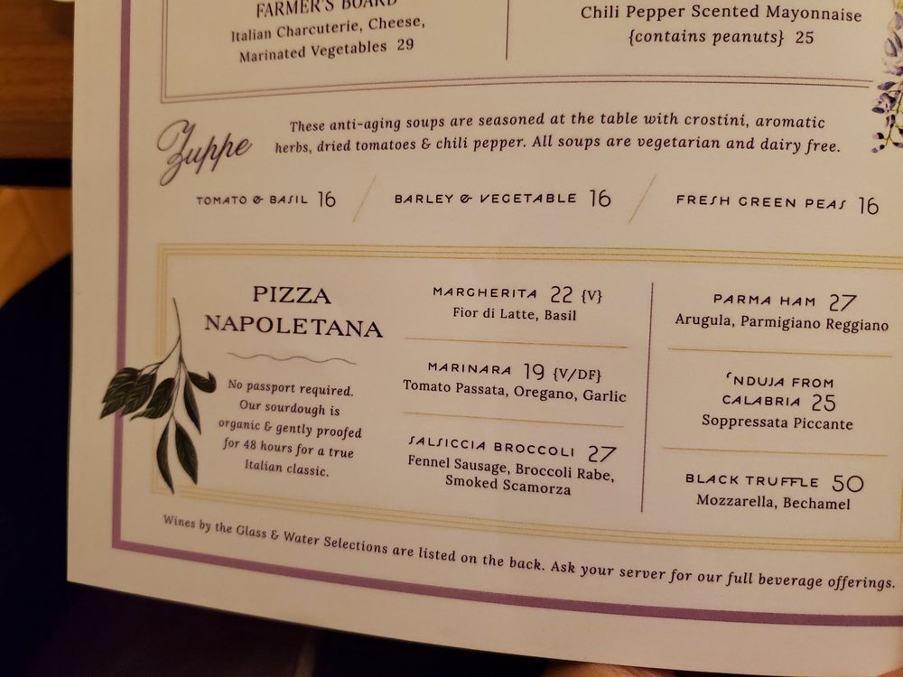 Cocchi Americano, Vecchio Amaro Del Capo, St. Germain, Rosemary Syrup, Prosecco {also available bottled for takeaway}. Named for the laccarino's family farm, a sip of this refreshing spritz inspires the sights and scents of the beautiful landscape and the fresh, organic ingredients it is renowned for